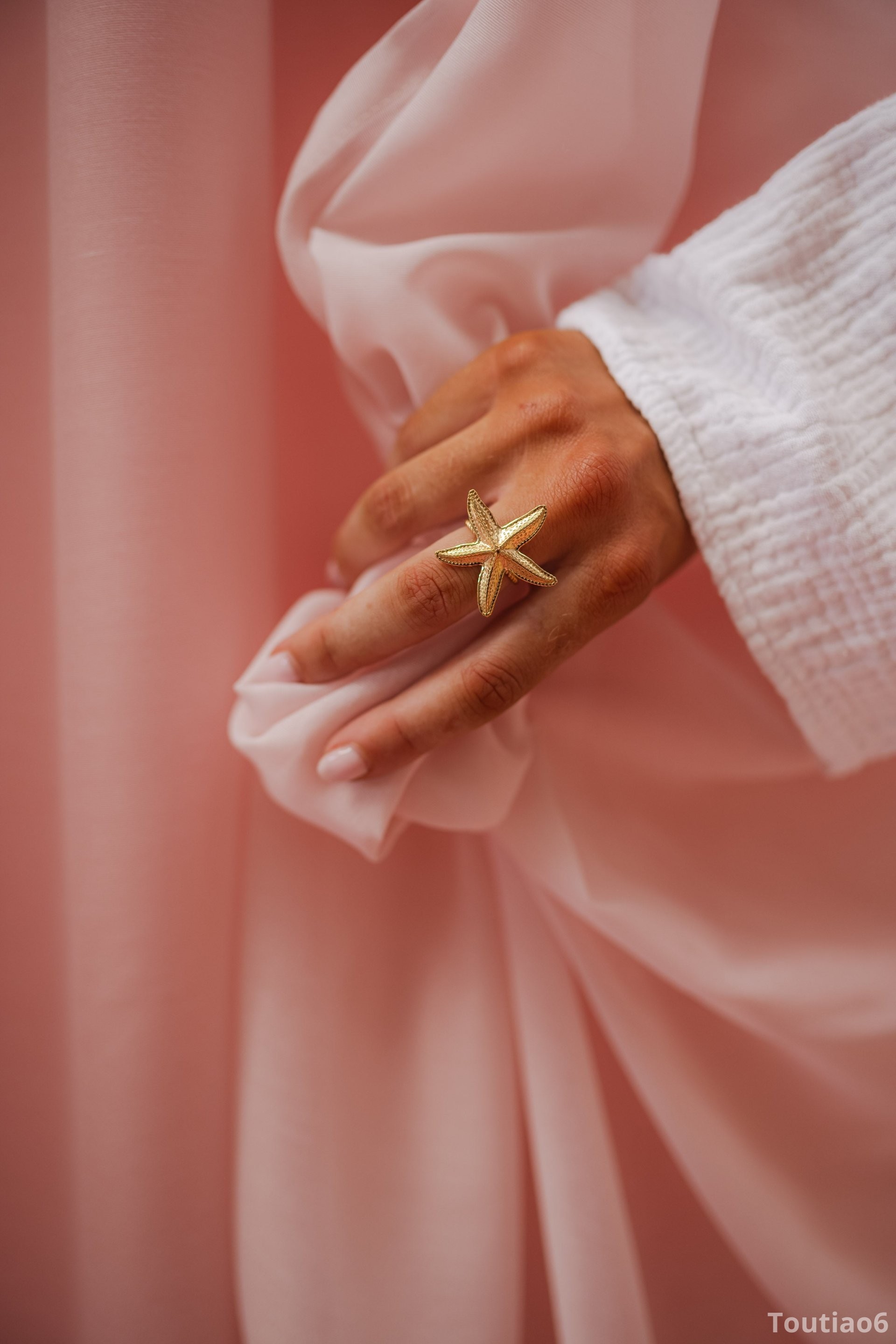 The Golden Huga Ring features a delicate starfish design, crafted in stainless steel with a shiny gold finish. Adjustable for a perfect fit, it’s a charming piece inspired by the sea.