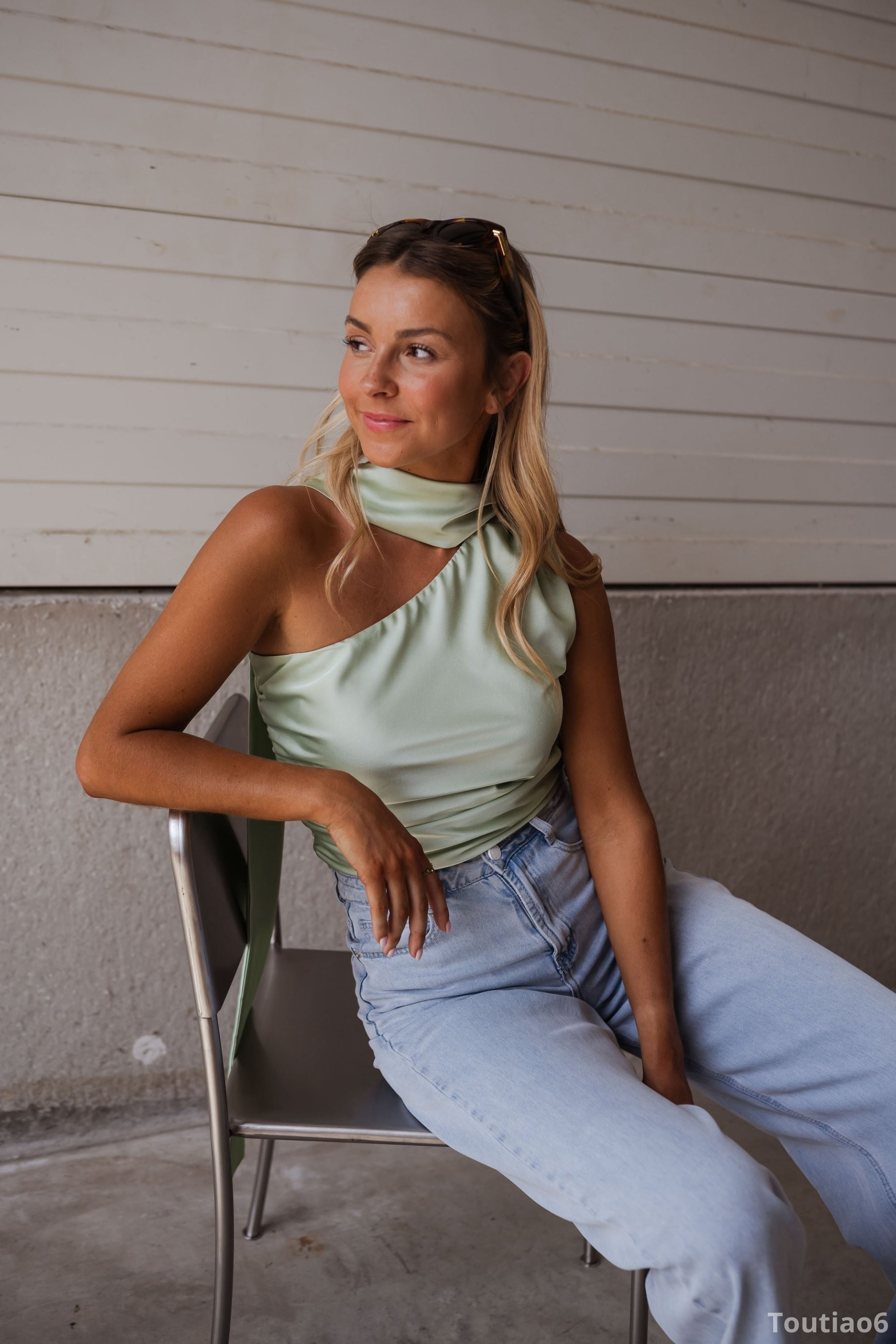 Chic and modern, the Mint Green Ilga Satin Top features a one-shoulder neckline, flowing necktie, and smooth satin texture. Lined and finished with a side zip, it’s made in Italy for an effortlessly polished look.