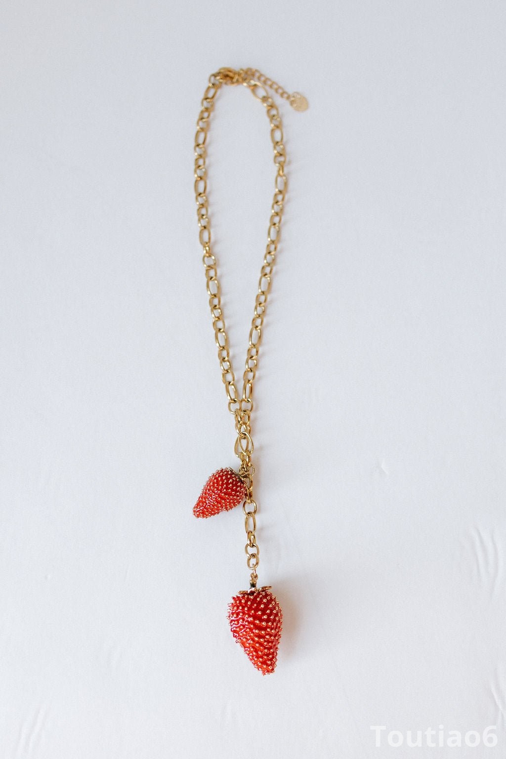This eye-catching accessory showcases large strawberry charms that dangle delightfully with every movement. Crafted from water-resistant materials, it's perfect for sunny adventures without worry. A juicy pop of color for your jewelry collection that's as fun as it is fashionable!