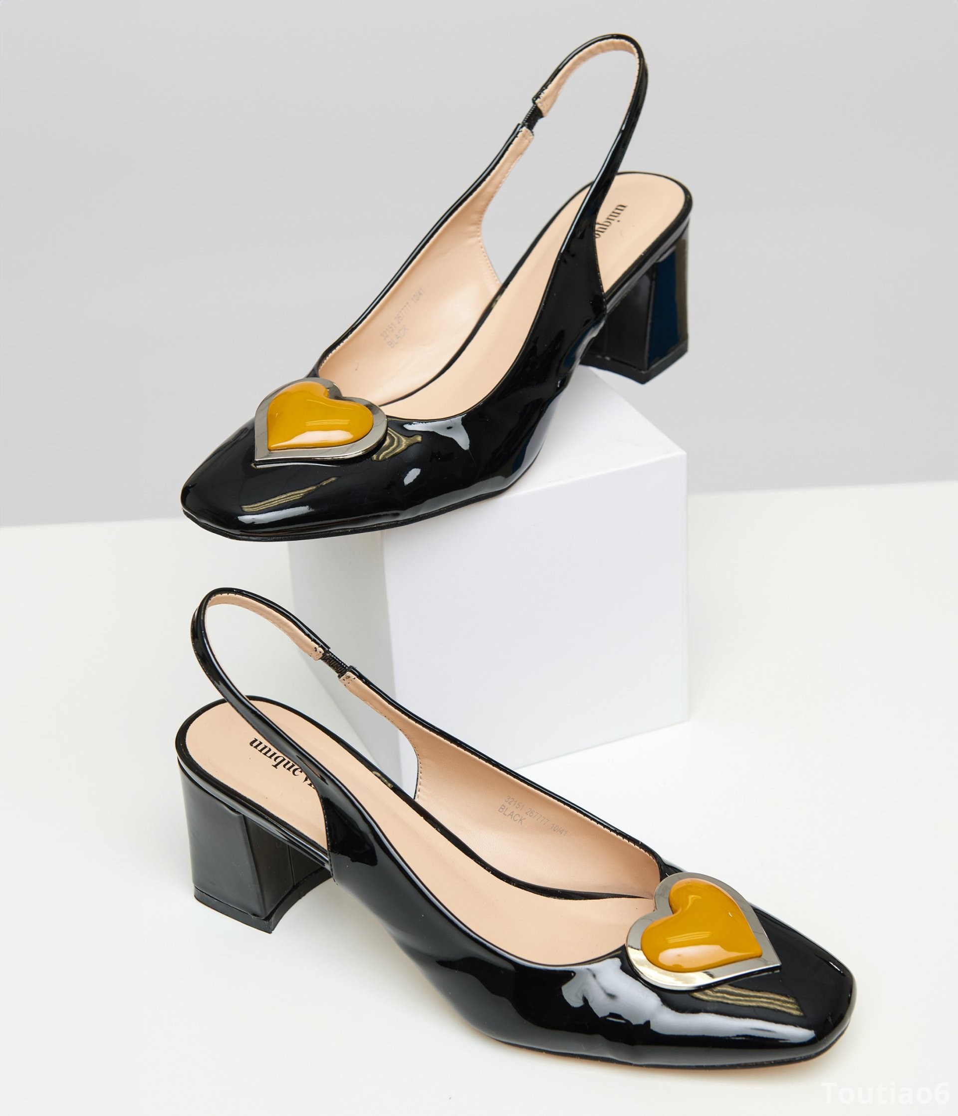 These sweet slingback heels from Unique Vintage are crafted in a black patent leatherette and feature an orange and gold heart accent on the vamp. Complete with a 3 inch block heel.