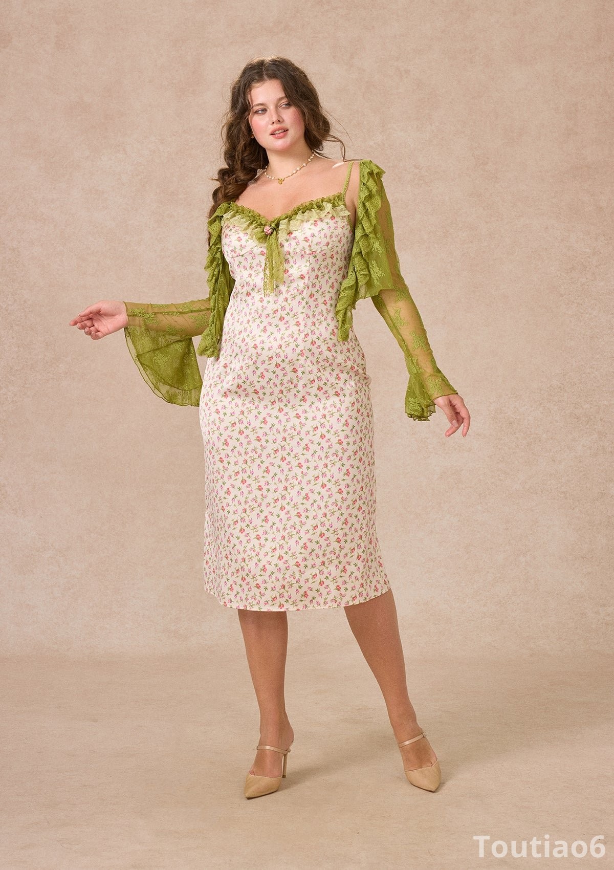 Soft florals and moss-toned lace come together like a quiet path hidden deep in the woods.With its graceful lines and delicate details, the whole look feels fresh, romantic, and gently enchanting.