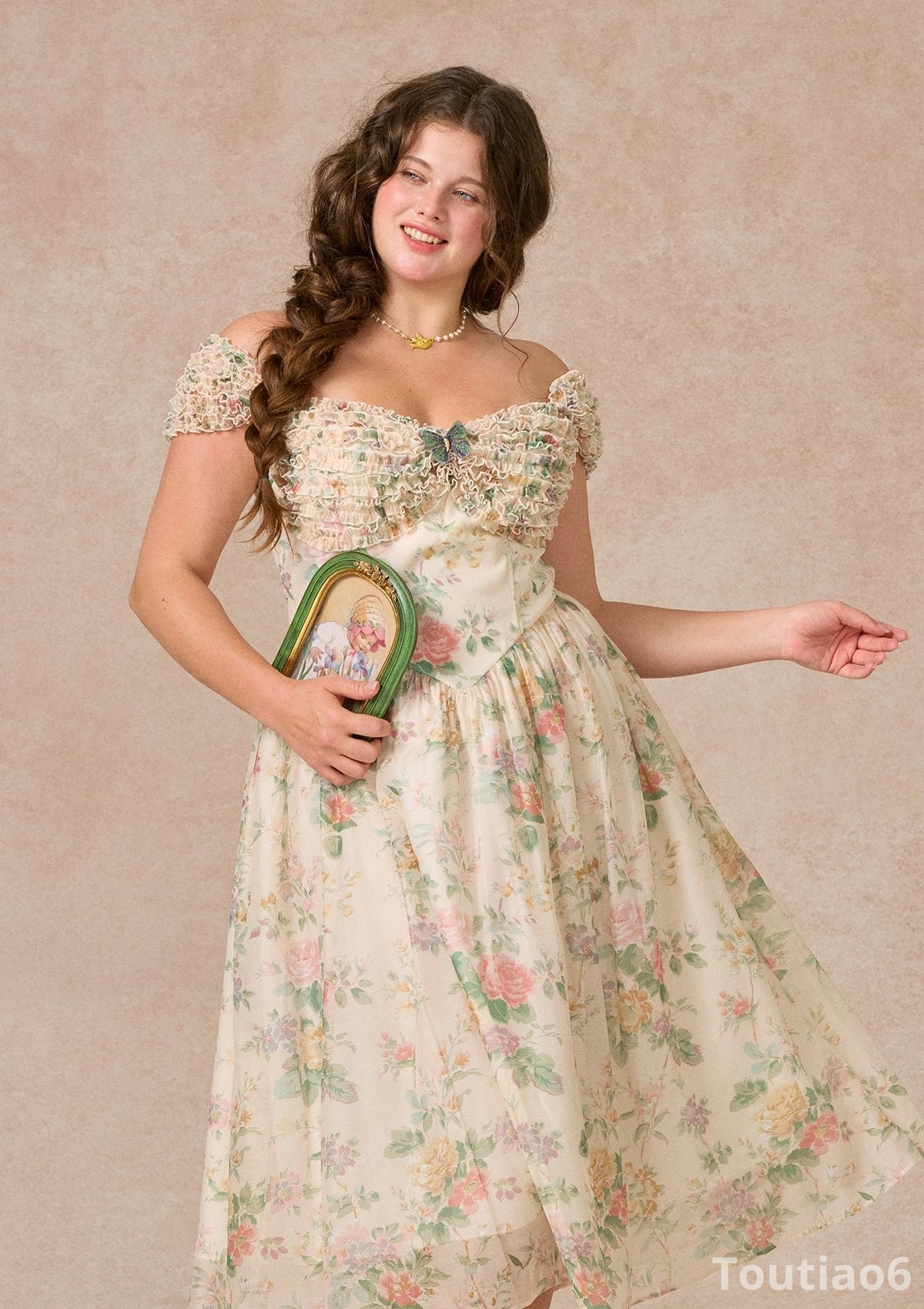 Soft floral shadows drift across the dress like pages from a quiet garden diary.With butterfly details and a flowing silhouette, the whole look feels tender, romantic, and gently enchanting.