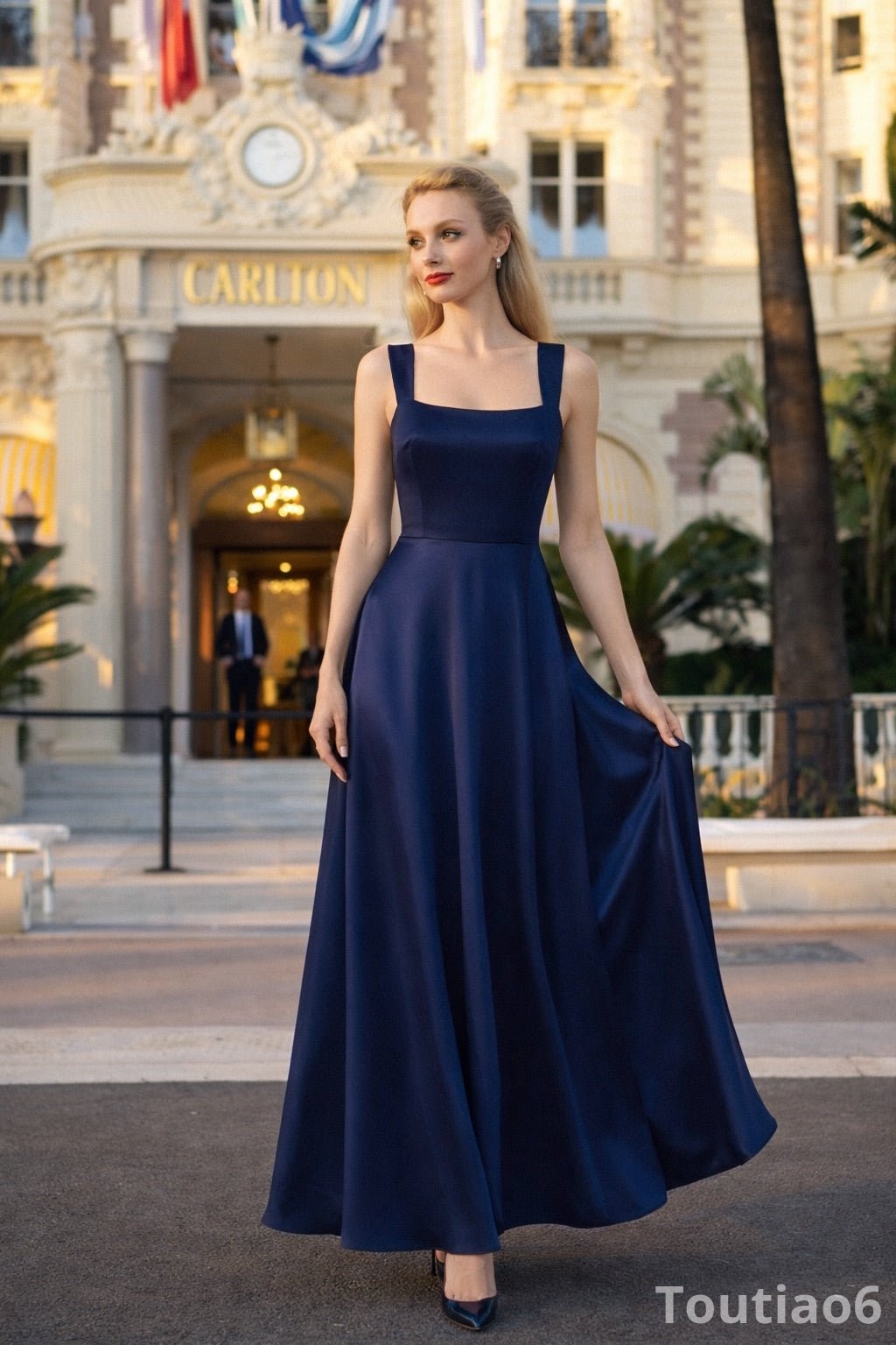 Created from premium upcycled triacetate, this dress features a square neckline framed by folded straps, a tailored waist, and a full skirt with a graceful overlay. The silhouette is completed with an open back and a concealed side zipper for a seamless finish.