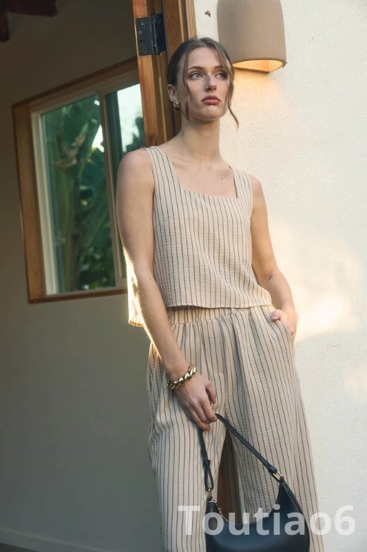 Pinstripe sleeveless tank with square neckline. Pair with the matchin Eleanor Pants for complete look.