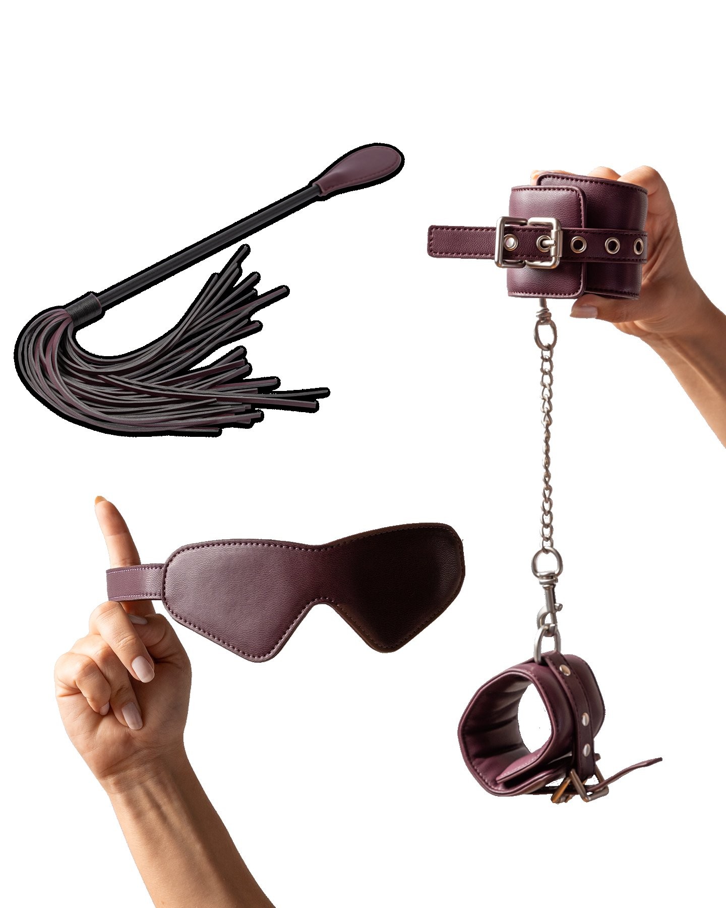 Explore your fantasies with an elevated twist on kink essentials. Mix & match your blindfold, padded cuffs, crop & tassel for a rollercoaster of sensations, from soft and playful to deliciously intense.