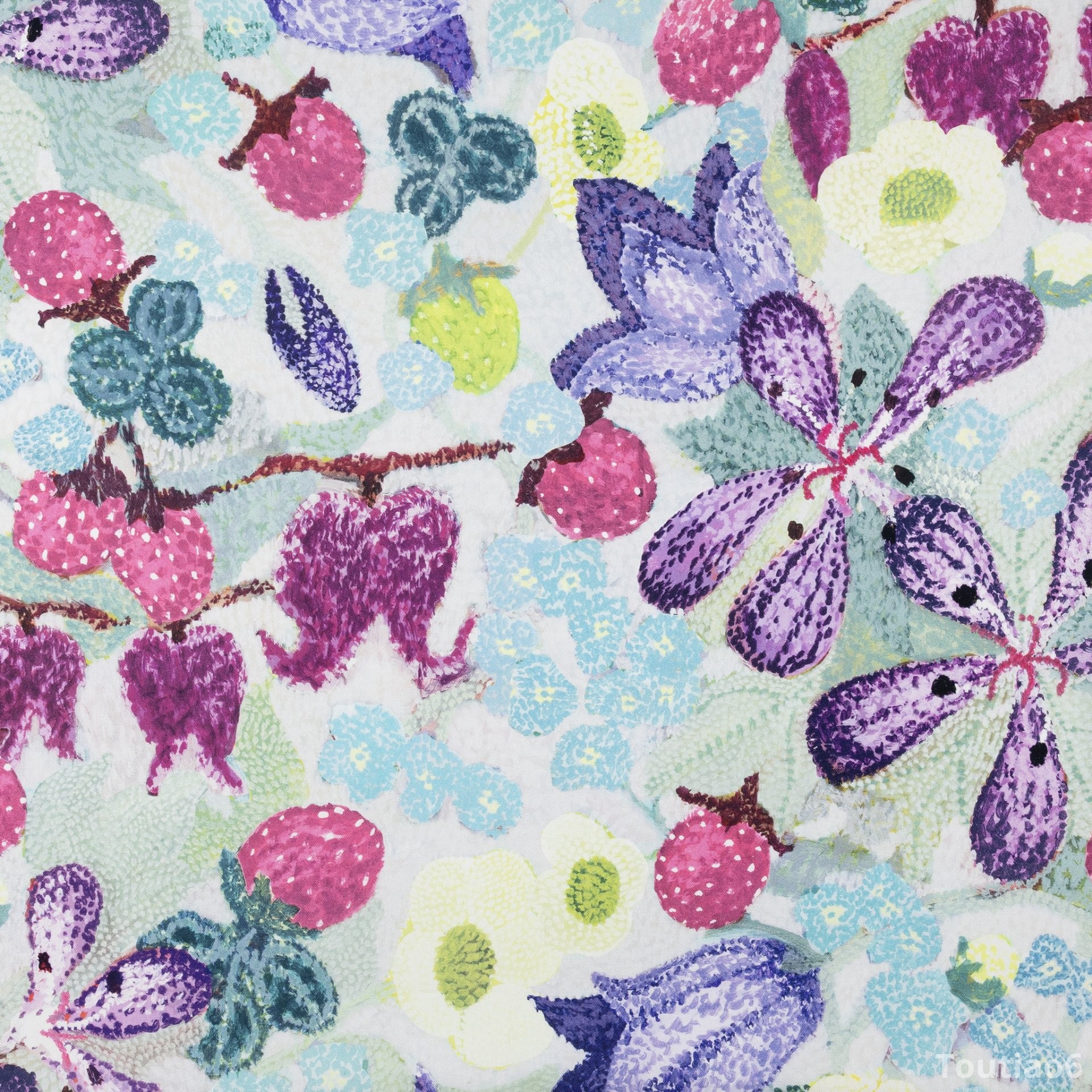 Summer plans sorted – play, laughter and living in the moment. The light and warmth of a northern summer, with colours glowing everywhere, invites you to go out and make memories, live fully and in the moment. The Kesä (Summer) pattern, designed by Lasse Kovanen includes Wild strawberries, Meadow buttercups, Bluebells and Cranesbills, all boldly put together. The outcome is full of childlike joy and carefree spirit. Lasse painted the pattern using the traditional tempera technique in a pointillist painting style. The playful and lush summer pattern is available as table setting and kitchen textiles, cushion covers and fabrics.The colourful cotton fabric of the Kesä collection is 150 cm wide.